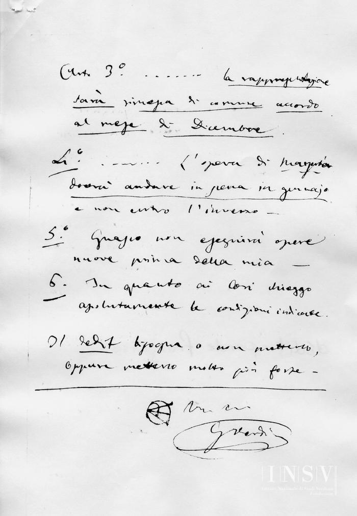 - Un bifolio, due facciate scritte. In alto a sinistra, a matita, di altra mano, entro circoletto: «2.». Accanto, timbro dell'Archive de l'Opéra. Sulla quarta facciata, di mano di Verdi: «Mr Escudier.