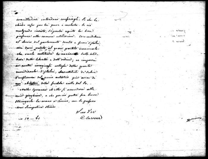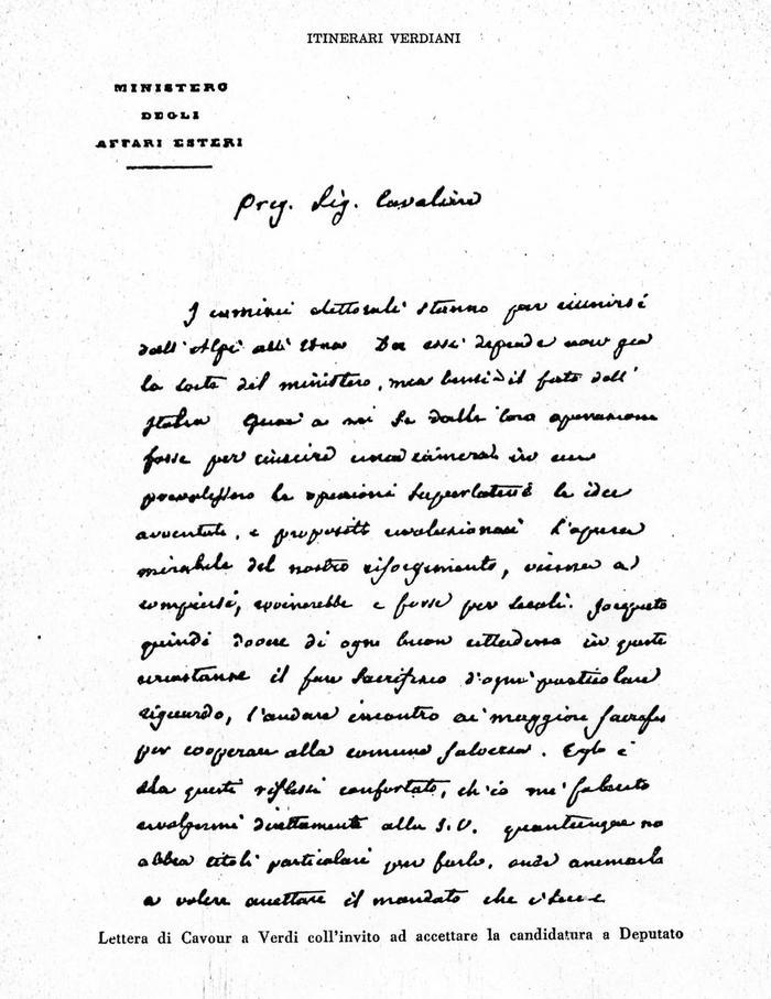 Camillo Benso Cavour a Giuseppe Verdi, 10/1861