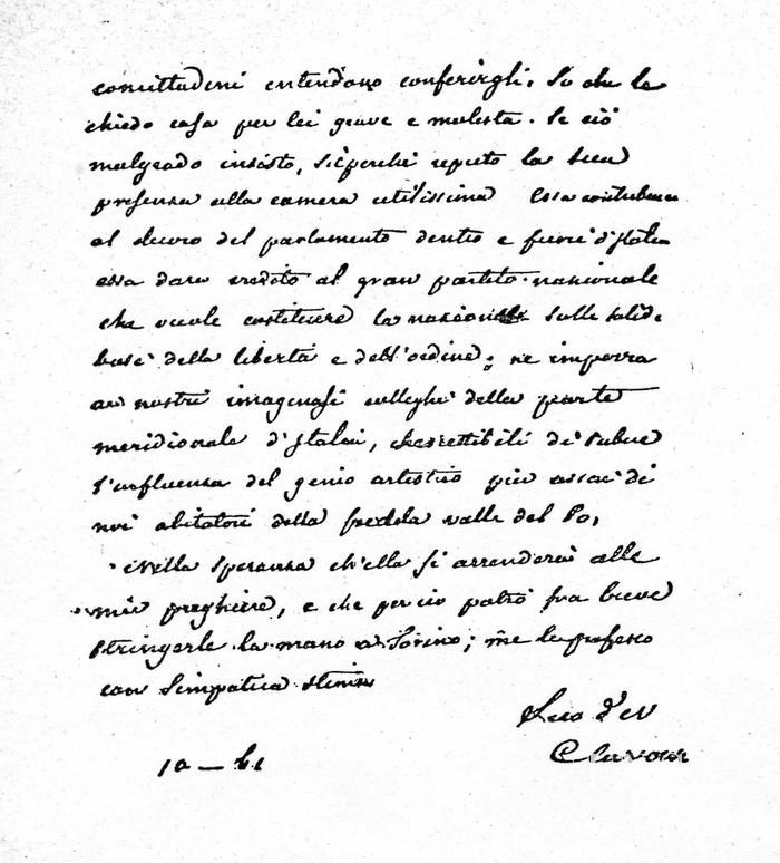 I comizii elettorali stanno per riunirsi dall’Alpi all’Etna. Da essi dipende non già la sorte del Ministero, ma bensì il fato dell’Italia. Guai a noi se dalle loro operazioni fosse per riuscire una Camera in cui prevalessero le opinioni superlative, le idee avventate, i propositi rivoluzionari. L’opera mirabile del nostro risorgimento, vicina a compiersi, rovinerebbe e forse per secoli. Io reputo quindi dovere di ogni buon cittadino in queste circostanze il fare sacrifizio d’ogni particolare riguardo, l’andare incontro ai maggiori sacrifizii per cooperare alla comune salvezza. Egli è da questi riflessi confortato, ch’io mi fo lecito rivolgermi direttamente alla S. V., quantunque non abbia titoli particolari per farlo, onde animarla a volere accettare il mandato che i suoi concittadini intendono conferirle. So che le chiedo cosa per lei grave e molesta. Se ciò malgrado insisto, si è perché reputo la sua presenza alla camera utilissima. Essa contribuirà al decoro del Parlamento dentro e fuori d’Italia, essa darà credito al gran partito nazionale che vuole costituire la nazione sulle solide basi della libertà e dell’ordine, ne imporrà ai nostri imaginosi colleghi della parte meridionale d’Italia, suscettibili di subire l’influenza del genio artistico più assai di noi abitatori della fredda valle del Po.